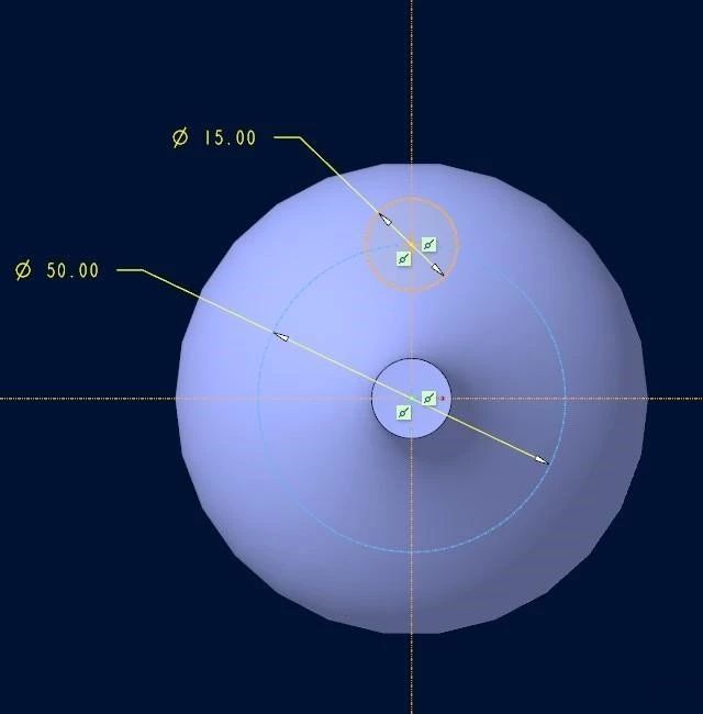 先隐藏上部分,在顶视图绘制一个直径为15的圆